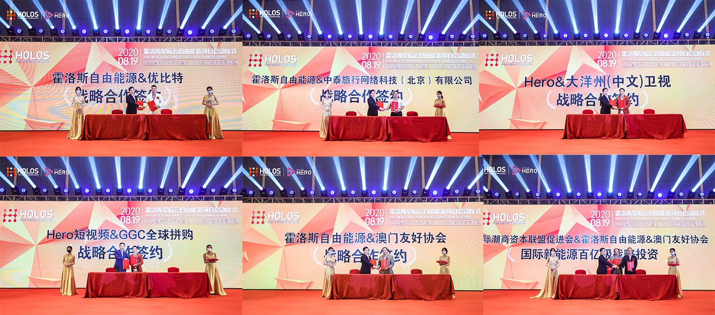 各位嘉宾发言完毕后,霍洛斯星际云自由能源项目的启动仪式正式开始,并进行了现场战略签约环节,在大家的见证下,双方共达成了多项战略合作,包括:霍洛斯自由能源&优比特战略合作签约、国际潮商资本联盟促进会&霍洛斯星际云&澳门友好协会国内新基建百亿战略投资合作签约、霍洛斯自由能源&澳门友好协会战略合作签约、霍洛斯自由能源&中泰旅行网络科技(北京)有限公司战略合作签约、Hero短视频&大洋洲战略合作签约、Hero短视频&GGC全球拼购战略合作签约。最后,霍洛斯星际云自由能源执行总裁,优比特超级节点扶骏翔扶总对大会进行了总结。他再次感谢了到场嘉宾们的到场和支持,现场精彩讨论和分享给整个行业带来积极影响。