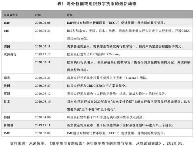 今年初,国际货币基金组织(IMF)将数字货币列为2020年的首要任务之一,国际清算银行与欧洲央行、英国央行、瑞士央行、日本央行和加拿大央行共同成立央行小组,开展CBDC应用案例研发。