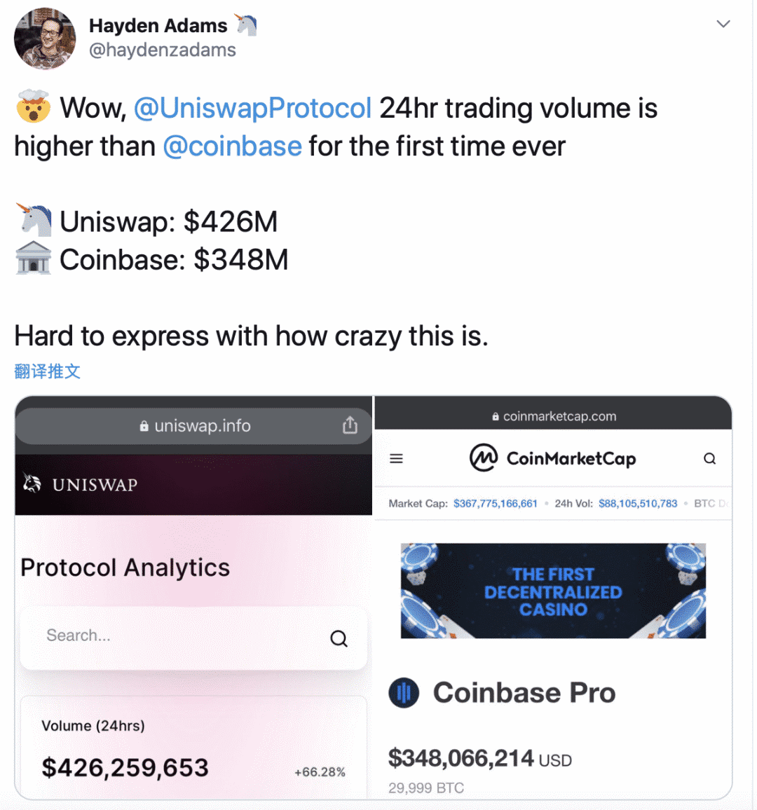 最近,DeFi去中心化交易所(DEX)赛道的龙头Uniswap的24小时交易量历史首次超过了主流中心化交易所(CEX) Coinbase,尽管Coinbase 并不是加密世界最大的交易所,但DEX似乎正在赶超传统的加密交易平台。