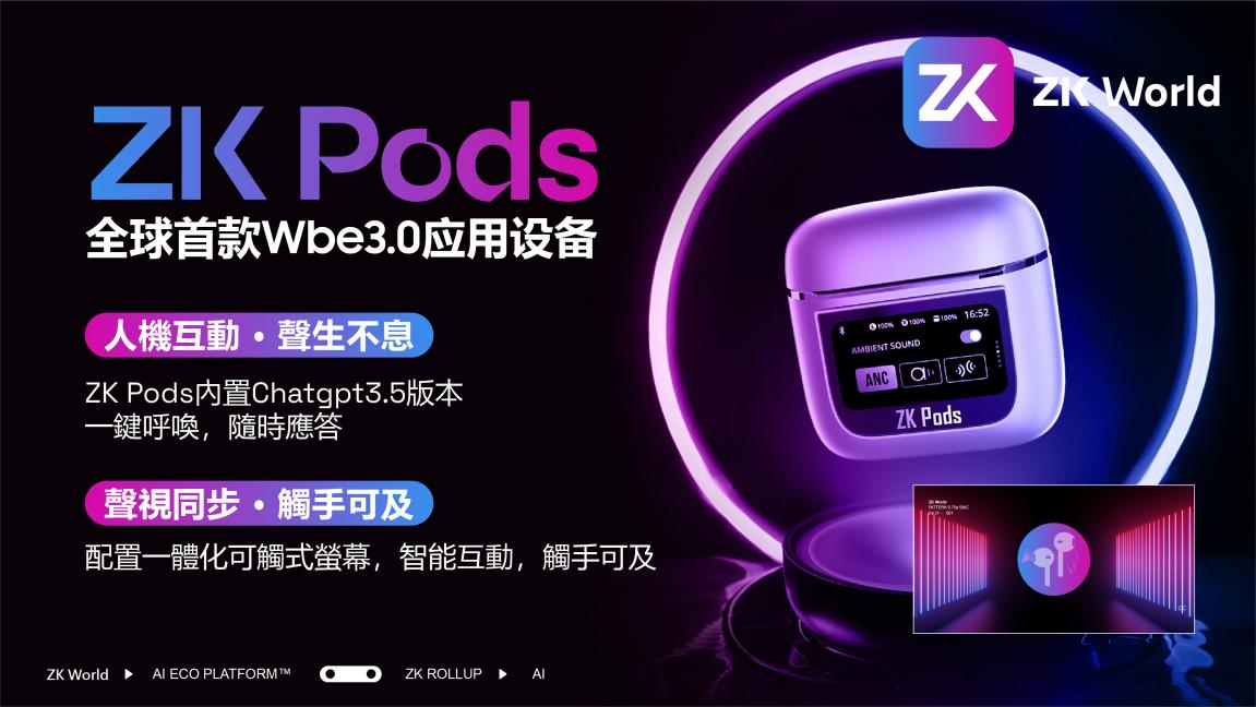 ZK Pods 是全球首款Wbe3.0应用设备ZK World首款重磅产品-ZK Pods,搭载Chatgpt3.5版本,结合无线蓝牙耳机便携功能,让Ai在你的生活中无处不在。适配安卓应用,可安装多种应用。