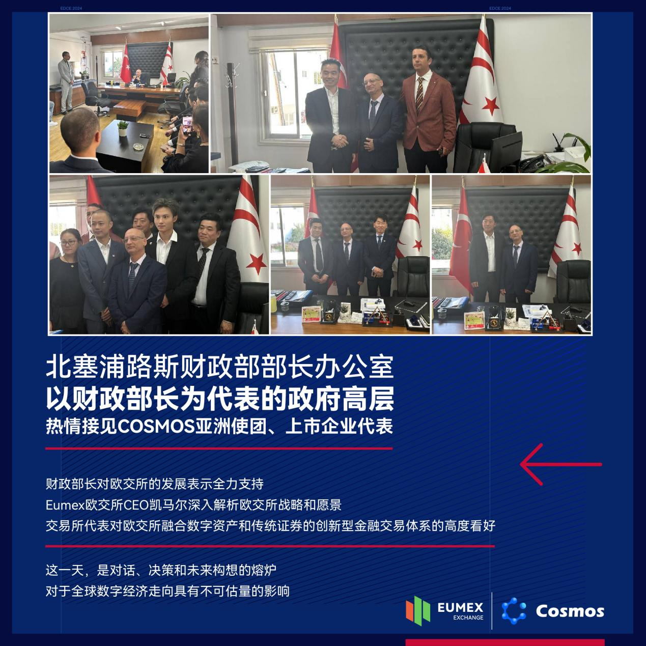 特别值得一提的是,副总统对COSMOS及其庞大社群的表态,表明北塞政府不仅欢迎COSMOS在欧交所的参与,还鼓励COSMOS在北塞设立公司,并积极探索在欧交所上市的机会。这一举动不仅为COSMOS在全球金融市场中的角色增添了新的维度,也为全球数字经济的多元发展开辟了新的道路,更是向全世界传递了一个明确的信号:北塞浦路斯土耳其共和国愿意成为全球数字经济创新和发展的前沿阵地。
