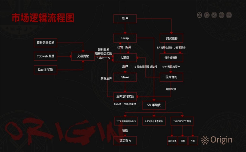 2.熔断保护机制:如果 Origin 代币的价格在单个交易日内 LGNS 价格下跌幅度超过 50%以上,协议将启动回购机制,销毁非稳定币 LGNS 代币,并铸造出匿名稳定币 A。