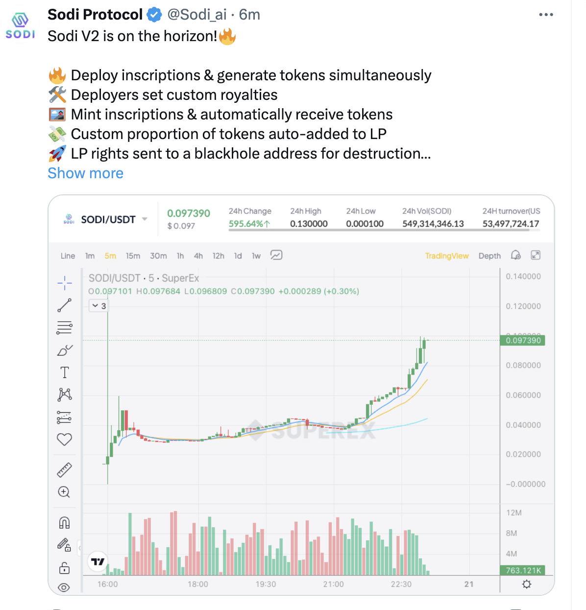 如今,SuperEx拥有超过1000万用户,60万+社交媒体粉丝,覆盖166个国家和地区。它支持1000多种加密货币的交易,并与超级钱包无缝集成,提供去中心化的资产存储与中心化交易所(CEX)的交易效率相结合。并且SuperEx已建立了全球最大的Web3.0生态的DAO社区之一。最重要的是SuperEx是最早拥抱铭文的交易所,已经沉淀了很多BTC铭文用户。Sodi也是基于铭文而出发的。